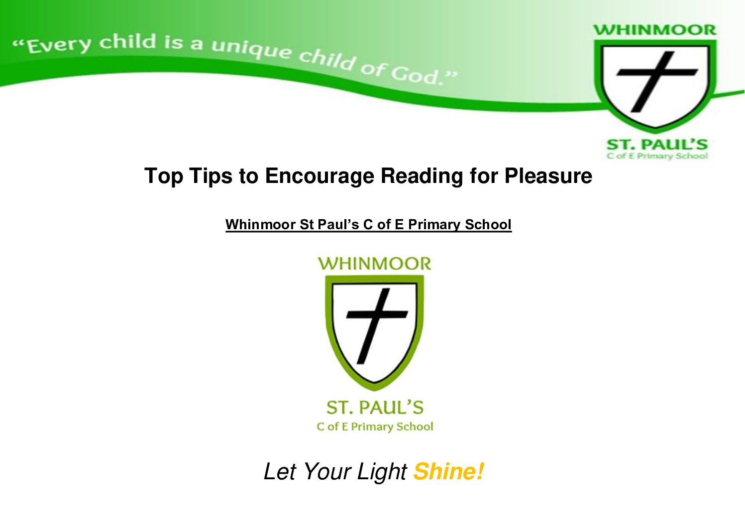 We expect pupils at Whinmoor St Paul’s Primary to develop a habit of reading widely and often, for both pleasure and a way of gaining information. We promote our reading culture in the following ways: