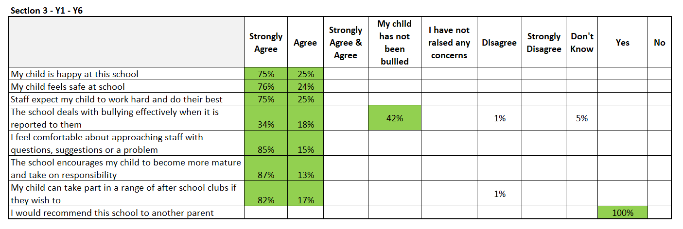 | The school supports my child’s wider personal development | 99% | Pupil Voice Survey to which areas/subjects/activities they would like as after school clubs. |